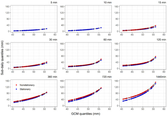 AMP quantiles at the station scale are presented in Figure 5, given the ensemble median performance. Figure 5 presents a comparison of stationary and non-stationary values, for those durations where the non-stationary behavior is identified. The results suggest larger quantile values for non-stationary conditions in comparison with stationary condition, with exception of low quantiles for short durations (e.g., less than 30-min duration). A similar quantile’s ascendance is identified between GEV modeling conditions, and the differences are greater for high rainfall durations. In addition, non-linear regression curve is presented, ensuring that the format is adequate to represent the relationship between sub-daily and GCM based historical data. Thus, results confirm that the adoption of non-stationarity in observed data in spatial downscaling is able to embed the effects of identified trends.