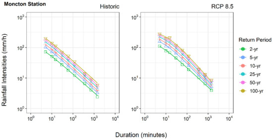 The following are available online at https://www.mdpi.com/article/10.3390/w13081008/s1, Figure S1: Rainfall depth estimation for different return periods and GCM models for Moncton station (RCP 2.6 emission scenario). Black point represents the rainfall depth estimated with the multimodel median ensemble. Red x represents the models in which results produce outliers, Figure S2: Rainfall depth estimation for different return periods and GCM models for Shearwater station (RCP 2.6 emission scenario). Black point represents the rainfall depth estimated with the multimodel median ensemble. Red x represents the models in which results produce outliers, Figure S3: Rainfall depth estimation for different return periods and GCM models for Moncton station (RCP 4.5 emission scenario). Black point represents the rainfall depth estimated with the multimodel median ensemble. Red x represents the models in which results produce outliers, Figure S4: Rainfall depth estimation for different return periods and GCM models for Shearwater station (RCP 4.5 emission scenario). Black point represents the rainfall depth estimated with the multimodel median ensemble. Red x represents the models in which results produce outliers, Figure S5: Rainfall intensities, in mm/h, estimated for the multimodel ensemble for the Moncton station, Figure S6: Rainfall intensities, in mm/h, estimated for the multimodel ensemble for the Shearwater station, Table S1: GEV model’s performance for historical annual maximum rainfall series of different durations of Moncton Station (the statistically significant GEV models are in bold (p < 0.05)), Table S2: GEV model’s performance for historical annual maximum rainfall series of different durations of Shearwater Station (the statistically significant GEV models are in bold (p < 0.05)), Table S3: 95th percentiles, in mm, of fitted GEV parameters for different RCP climate projections and multi-model ensemble for Moncton station, Table S4: 95th percentiles, in mm, of fitted GEV parameters for different RCP climate projections and multi-model ensemble for Shearwater station, Table S5: Rainfall intensities, in mm/h, estimated for the multimodel ensemble for the Moncton station, Table S6: Rainfall intensities, in mm/h, estimated for the multimodel ensemble for the Shearwater station.