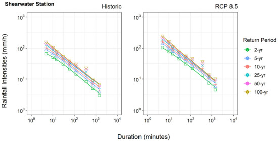 In general, the change imposed by the climate in future is higher for Moncton than for Shearwater, based on the all RCP scenarios, since the degree of change on precipitation is higher for Moncton. The results suggest that return period can be extremely reduced in the future. The magnitude of reduction varies with duration and is much higher under the non-stationary behavior. For example, the observed 100-year return period event of 1440-min duration is 5.9 mm/h, and it is smaller than 6.0 mm/h of the 10-year return period future extreme event for RCP 8.5 scenario at Moncton station. A similar reduction is found for Shearwater station.