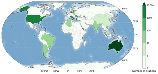A database with information about the time resolution of rainfall data in different geographic areas of the world was recently published [35]. It provides, for each of the 25,423 rain gauge stations considered from 32 study areas, the complete ta history and the site geographical coordinates (see Figure 4). The main characteristics of the available rainfall observations, grouped by continent, are shown in Table 1.