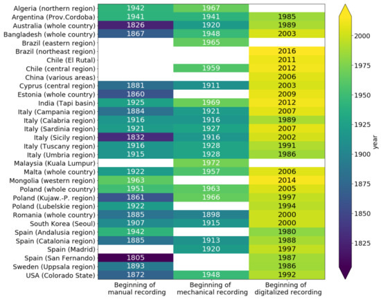 Year of beginning of manual, mechanical, and digital rainfall recordings for the study areas considered in [35].