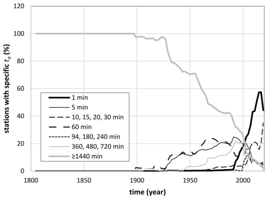 Due to the heterogeneity of the database stations, it is hard to synthesize by unique figures and tables the history of all the study areas considered in [35]. In some countries, the history of a single rain gauge is available, as in the case of the Madrid station, while in some others, a network with thousands of rain gauges is involved, as in the case of Australia and Colorado (United States). In any case, Figure 6 attempts to solve the problem by showing the percentage of rain gauges with specific ta for all the stations except those of Australia and Colorado (United States), whose huge numbers would make the plot confusing. From Figure 6, it is possible to deduce that about 50% of stations today have adopted ta = 1 min due to the spread of continuous recording, while data with ta = 1440 min are going to disappear in the near future.