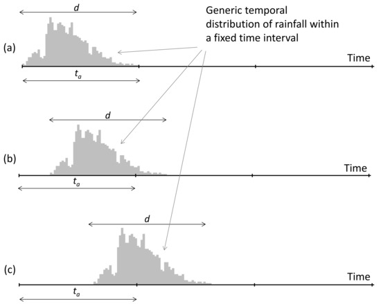Following [37,38], indicating by x(t) the rainfall depth observed at time t at a specific site, the cumulative rainfall recorded over a time period d, xd(t), is expressed as: