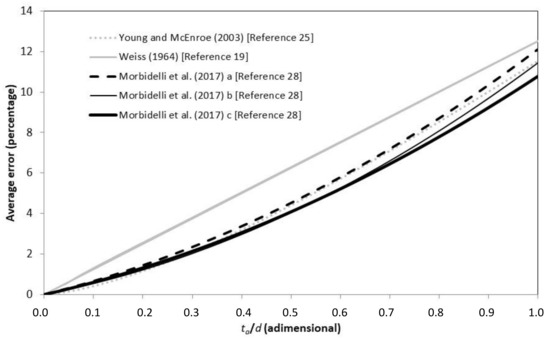 Figure 8 shows the relationships proposed in [19,25,28] to quantify the average underestimation with variable ratio ta/d. Reference [19] originally proposed the function expressed as: