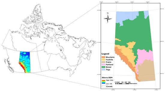 - Ecological Stratification Working Group. A National Ecological Framework for Canada; Agriculture and Agri-Food Canada, Research Branch, Centre for Land and Biological Resources Research and Environment Canada, State of Environment Directorate: Ottawa, ON, Canada; Hull, QC, Canada, 1996; pp. 1–125. [Google Scholar]
