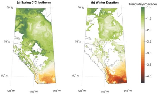 - Bonsal, B.R.; Prowse, T.D. Trends and variability in spring and autumn 0 °C-isotherm dates over Canada. Clim. Chang. 2003, 57, 341–358. [Google Scholar] [CrossRef]