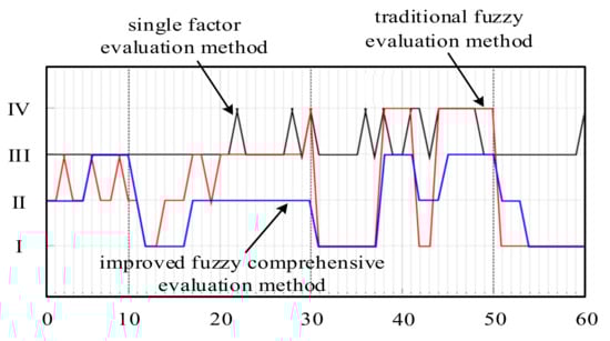 In order to clearly express the impact of the improved method on the evaluation results, according to the comparison with the single factor water quality evaluation method and traditional fuzzy water quality evaluation method, this paper draws a contrast curve chart, as shown in Figure 2. It can be seen from Figure 2 that in the 60 measurements of the single factor water quality evaluation method, most of the water quality evaluation grade are level III or IV. The test results of the traditional fuzzy comprehensive evaluation method fluctuate greatly. While after improving the method, in the 30th to 50th test data, the content of each evaluation factor does not have a big mutation, but within a reasonable range, small fluctuations cause the evaluation result to have multiple mutations in this interval.
