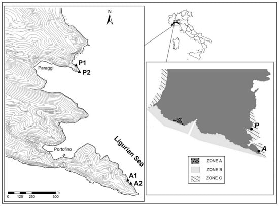 Map of the study area (Portofino, Genoa, Italy) with indication of the sampling stations: P: Paraggi; A: Aurora; 1: sub-vertical slope; 2: inclined slope. Zonation of the Marine Protected Area: Zone A, integral reserve zone; Zone B, general reserve zone; Zone C, partial reserve zone.
