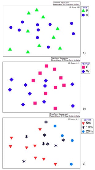 The two-way crossed ANOSIM carried out assessing site × period interactions revealed significant differences only in relation to the temporal variations (ANOSIM, R2 = 0.24; p = 0.021), while there were no significant variations of the assemblage structure between Paraggi and Aurora (ANOSIM, p > 0.05). However, when nested ANOSIM was carried out considering the interactions between depth and site, a significant difference between depths was detected (ANOSIM, R2 = 0.28; p = 0.017), while no significant differences were detected in the interaction depth × period (ANOSIM, R2 = 0.18; p = 0.056). A visualization of the factor effects (namely sites, periods, depths) on the structure of the copepod assemblage was obtained by means of nMDS (Bray-Curtis similarity, square root transformation Figure 2).