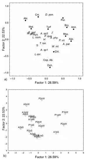 (a) Principal component analysis (PCA) of macrobenthic percentage coverage used as primary variables without contributing to the overall variance explained by the PCA. The copepod species and faunal parameters (relative abundances and indices) were projected on the factor plane as supplementary variables, with no contribution to the results of the analysis; (b) Plot of the cases obtained by the projection of the active variables on the factor plane. All the abbreviations of the taxa are listed hereafter: Longipedia coronata: L. cor.; Porcellidium viride: P. vir.; Thalestris cfr longimana: T. lon.; Phyllothalestris mysis: P. mys.; Diarthrodes ponticus: D. pon.; Amphiascus sp1: A. sp1; Amphiascus sp3: A. sp3; Amonardia phyllopus: A. phy.; Ameira cfr parvula: A. par.; Wellsopsyllus (Intermediopsyllus) intermedius: W. Int.; Morariopsis sp1: M. sp1; Laophonte cornuta: L. corn.; Paralaophonte cfr quaterspinata: P. qua.; Esola sp1: E. sp1; Cnidaria: Cni.; Mollusca: Mol.; Porifera: Por.; Bryozoa: Bry.; Annelida: Ann.; Ascidiacea: Asc.; Ochrophyta: Ocr.; Rhodophyta: Rho.; Chlorophyta: Chl.; Copepoda Abundance: Cop. Ab.; Abiotic: Abi.