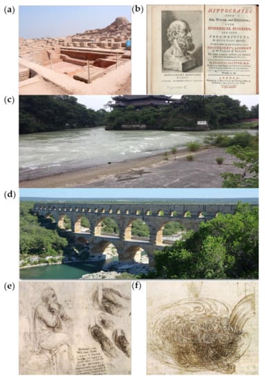 Public Health Age of Environmental Hydraulics. (a) Great Bath, Mohenjo-Daro, Pakistan (3000 BC) (Wikimedia, Saqib Qayyum) (b) Hippocrates (ca.460–ca.370 BC) (Wikimedia) (c) Dujiangyan city system, China (ca. 300 BC) (Photo by C. Gualtieri) (d) Roman aqueduct at Pont du Gard, France (1st Century) (Wikimedia) (e) Leonardo da Vinci. Seated old man, studying a water current (ca 1500) (Windsor Castle, The Royal Collection, RL 12579) (f) Leonardo da Vinci. Sketches of a plunging water jet into a pool, with the resultant turbulent flow (ca 1500) (Windsor Castle, The Royal Collection, RCIN 91266).