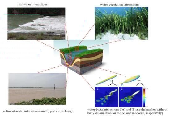 An environmental interface can be defined as a surface between two either abiotic or biotic systems that are in relative motion and exchange mass, heat, and momentum through biophysical and/or chemical processes. These processes are fluctuating temporally and spatially. These interfaces in the EH realm are: air-water [], water-sediment [], water-aquatic organisms [], water-vegetation [], and water-porous medium [] interfaces (Figure 3). The concept of environmental interface is also consistent with Professor Nikora’s remark on the need for integration among Aquatic Ecology, Biomechanics and Environmental Fluid Mechanics into the Hydrodynamics of Aquatic Ecosystems that deals with two key interconnected issues, i.e., physical interactions between flow and organism and ecologically relevant mass-transfer-uptake processes []. Further studies are also needed to improve our current knowledge about exchange processes at the environmental interfaces.