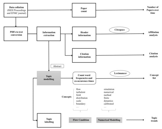 The study first presents the historical evolution of EH during three different paradigms or ages: Public Health Age, when the unique focus was on microbiological pollution and its impact on human communities, Water Quality Age, when the focus was on water quality of aquatic systems, Integrated Environmental Hydraulics Age when the traditional problems are integrated with advanced treatment of turbulence and full consideration of the exchanges processes involving any natural water system. Second, the applied methodology of the bibliometric analysis, the tools Citespace and Leximancer, is introduced. Third, the results in terms of nationality and affiliations are presented to identify patterns of collaboration among scientific institutions (universities and research institutes) and authors, which is followed by an analysis of the temporal evolution of the EFMC impact index as well as its highly-cited articles. Finally, the major EH topics are presented with a comparison between the topics extracted from the two different sources.