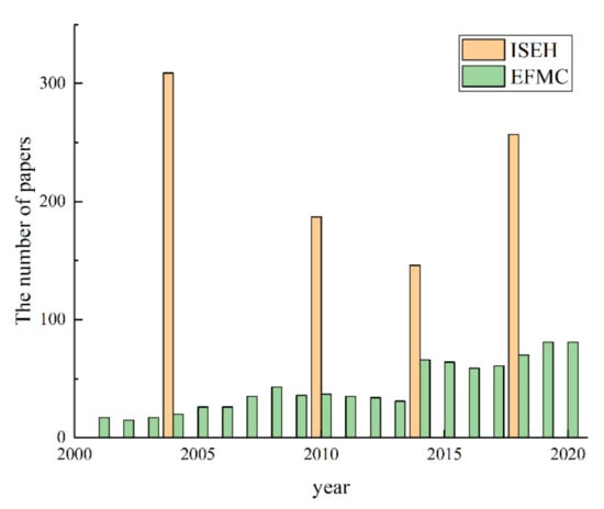 We analyzed the number of papers for each edition of the ISEH and each year of the EFMC (Figure 5). The number of papers of ISEH proceedings fluctuated from around 150 to above 300, whereas the annual publication volume of EFMC journal showed an overall increasing trend throughout the time.