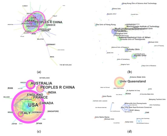 Visualization map of the distribution of papers among research-related organizations (universities and research institutes) and geographical areas. Note: The higher the frequency of occurrence, the larger the font displayed in the figures. (a) Country distribution of ISEH proceedings (b) Institution distribution of ISEH proceedings (c) Country distribution of EFMC articles (d) Institution distribution of EFMC articles.