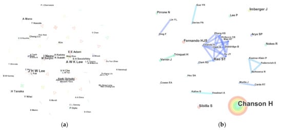 Visualization map of the author of papers. (a) Author distribution of ISEH proceedings (b) Author distribution of EFMC articles.