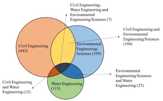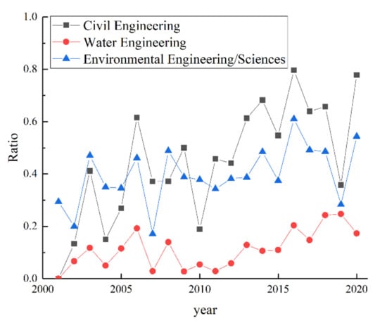 Figure 8 shows the department to which authors are affiliated for EFMC journal articles. The results indicate that the majority are from Civil Engineering (443), Environmental Engineering/Sciences (359), and Water Engineering (115) with some overlapping among each other. The changes of the departmental affiliation throughout the time are shown in Figure 9. According to the result of the linear fitting, the ratios of the number of articles published by each departmental category to the total number of articles in each year increased persistently for all three departmental categories.