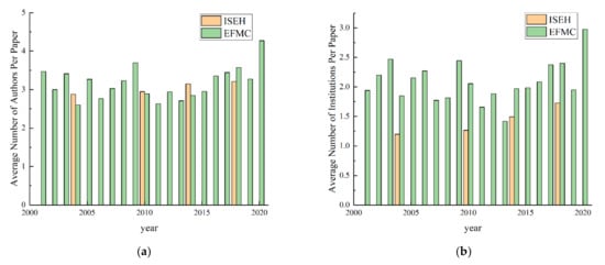 (a) Change in the average number of authors per paper. (b) Change in the average number of institutions for four proceedings of ISEH (2004, 2010, 2014, and 2018), respectively, and journals of EFMC in each year.