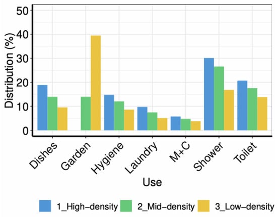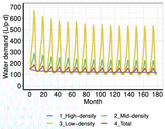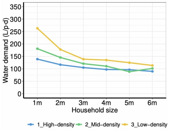 Although domestic water use contributes to all three of these groups (Table 1), some uses are usually seen as non-essential, such as water-based recreation (e.g., swimming pool) or social-status enhancement (e.g., ornamental gardens) [39]. In modern housing, these non-essential uses are usually linked with outdoor uses. In contrast, indoor uses are mainly focused on physiological and hygienic needs, which explains why (indoor) water use is acknowledged to be inelastic. Hence pricing-based policies usually have little effect on water use [20,24]. Therefore, it is common to consider different housing types or economic classes to explore water trends [39]. Households are often approached as the key agent (i.e., decision-making unit) to analyse the relationships between population and domestic water use, since such domestic uses are done at the household scale [40,43]. Usually, only basic actions are considered relevant for domestic use modelling, such as demanding water and adopting water-saving behaviours [44]—leaving out a variety of factors and variables [45]. Hence, exploring future scenarios of domestic water use should account for socio-demographic trends, concerning population growth, household sizes, and housing typologies. In the context of urban areas of the developed world, socio-demographic trends indicate a future reduction in household size towards smaller or single-person household units, leading to an increase in housing demand for smaller flats, preferably rented than in ownership [8].