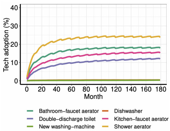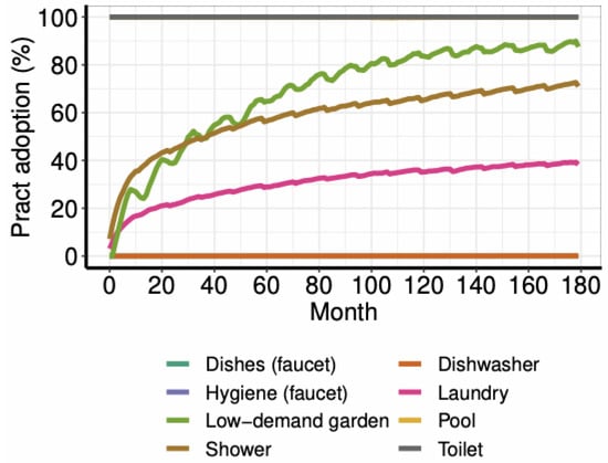 Modelling utility assessments in water use is not trivial. On the one hand, habit adoption is often related to tolerance towards loss of short-term utility. For instance, for households that value wealth, one may consider that money savings associated with conservation practices are often negligible in comparison to losses of convenience (i.e., effort avoiding, and comfort). In technology adoption, although water-efficient appliances have a relevant impact in water use. In this sense, water savings are not the main factor when assessing the adoption: Other factors are more relevant (for instance, a dishwasher is more likely to be bought due to comfort increase rather than water savings), because water costs are usually a negligible fraction of the households’ expenses for wealthy users [20]. Thus, some factors in adoption decision-making processes are difficult to be modelled in a way to avoid that model becomes too complicated and involves too many factors and variables [63].
