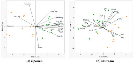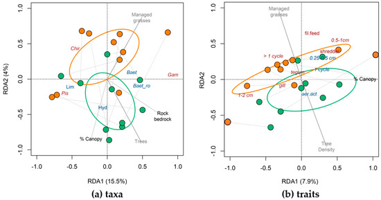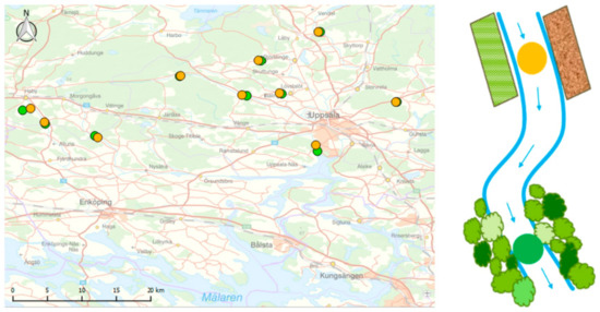- McKie, B.G.; Sandin, L.; Carlson, P.E.; Johnson, R.K. Species traits reveal effects of land use, season and habitat on the potential subsidy of stream invertebrates to terrestrial food webs. Aquat. Sci. 2018, 80, 15. [Google Scholar] [CrossRef]
