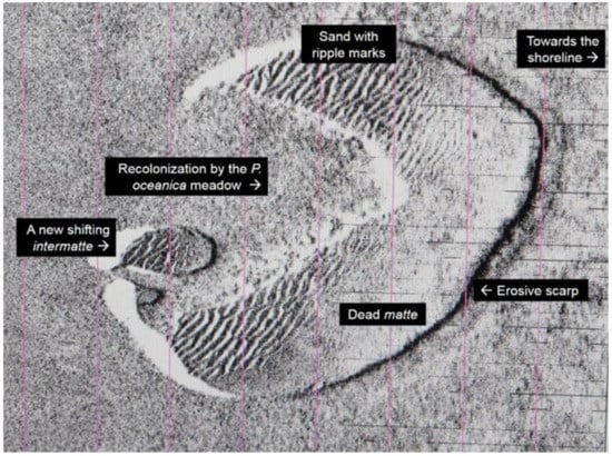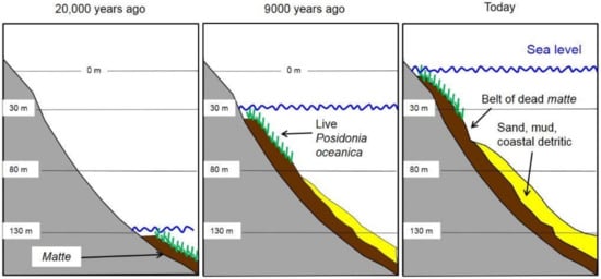 - Leriche, A.; Pasqualini, V.; Boudouresque, C.F.; Bernard, G.; Bonhomme, P.; Clabaut, P.; Denis, J. Spatial, temporal and structural variations of a Posidonia oceanica seagrass meadow facing human activities. Aquat. Bot. 2006, 84, 287–293. [Google Scholar] [CrossRef]