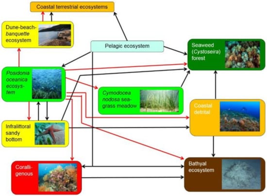 - Boudouresque, C.F.; Pergent, G.; Pergent-Martini, C.; Ruitton, S.; Thibaut, T.; Verlaque, V. The necromass of the Posidonia oceanica seagrass meadow: Fate, role, ecosystem services and vulnerability. Hydrobiologia 2016, 781, 25–42. [Google Scholar] [CrossRef]