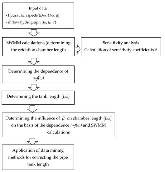 A novel modification of the graphical–analytical method of retention tank design (dimensioning) by introducing an advanced sensitivity analysis and modeling error was proposed. The presented approach constitutes an extension of the previously employed graphical–analytical tank dimensioning methods with the algorithms enabling us to improve the accuracy of the obtained calculation results. Using the graphical and analytical method, it was possible to pre-define the length of the tank chamber and to design the overflow devices. The additional implementation of data mining methods allowed us to detail the simulation results so that they were consistent with the results of the calculations of the length of the reservoir chamber obtained by means of differential equations. Statistical models determined with the data mining methods were employed for this purpose. The steps of the proposed methodology are presented in Figure 1. Compared with the graphical–analytical methods developed thus far, the proposed methodology enabled the determining the factors affecting the errors resulting from the interpolation of the dependencies between the characteristics of the influent hydrograph and the parameters of the outlet devices and pipe tank dimensions. The sensitivity analysis, which enabled the determination of the key parameters affecting the results of the tank parameter calculations and the influence of their uncertainty on the simulation results, constitutes an important element of the presented calculation methodology.