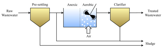 A conventional ASP is usually operated with no settlement in the aeration tank, and a completely separate settlement tank with continuous sludge removal [11]. However, in an alternating activated sludge process (AASP), the sludge is allowed to settle inside the aeration tank during anoxic treatment periods. Then aerobic treatment is facilitated by supplying compressed air, or sometimes pure oxygen, through diffusers and/or by surface agitation [11]. These treatments are also referred to as the denitrification and nitrification processes, which require anoxic and aerobic conditions, respectively. A sketch of the AASP is shown in Figure 1.