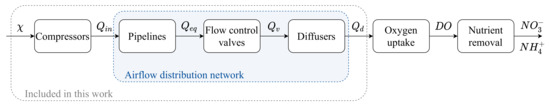 The relevant subsystems must first be modelled in order to utilize the models for controller design and scheduling improvement. Figure 2 illustrates a typical WWTP aeration system, where the input is compressor load percentage () for all compressors and output is the nutrient concentration in the wastewater. The subsystems considered in this work are marked inside the grey dashed rectangle. Note that all signals presented in Figure 2 can be one-dimensional or multi-dimensional, depending on the specific WWTP layout.