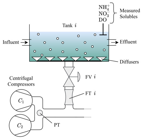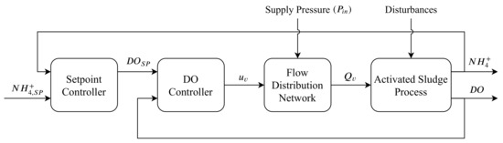 As noted in Figure 3, the airflow and DO, nitrate (NO) and ammonium (NH) concentrations are measured in each tank. Lastly, the pressure in the air supply pipe is measured upstream to the aeration tanks. The influent and effluent concentrations are unknown, as well as the volume of entering wastewater. Due to unknown wastewater inputs, as well as external conditions affecting the biochemical processes, disturbance effects are introduced in the ASP [42]. Hence, to achieve proper nitrogen removal, a system of cascaded controllers maintains the concentrations of nitrate and ammonium to desired set-points. A block diagram of the general system is shown in Figure 4.