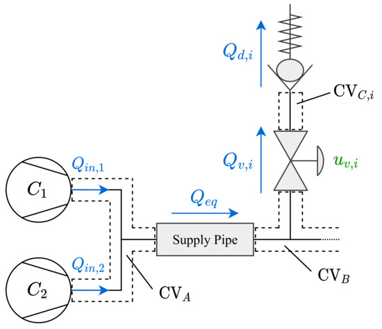 The airflow distribution network can be modelled from Bernoulli’s equation, with the pipe pressure losses approximated by the Darcy-Weisbach equation and static pressure losses from components [28,55]. The flow elements: valves and air diffusers, are modelled based on known physical relations and by fitting polynomials to manufacturers’ data. A diagram of the relevant elements in the airflow distribution network is shown in Figure 5.