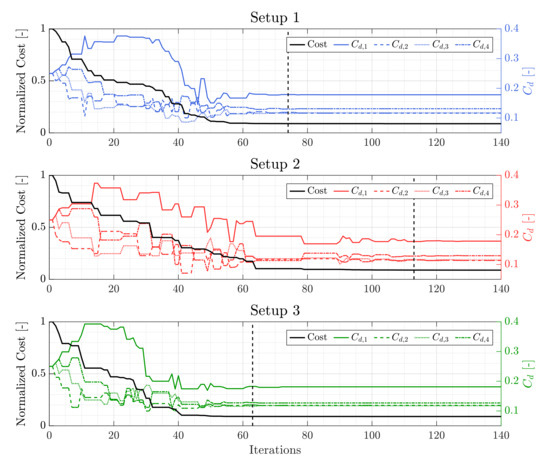 where is the k’th airflow measurement to the i’th tank. is the model estimate of the airflow. A subset of 16 h in the nine day dataset was used for identification. As it is known from the work [62], the NM method is sensitive to initial simplex points and values of NM coefficients, i.e., reflection , expansion , contraction and simplex size . Therefore, we have applied the NM method with different coefficients proposed in [63,64], the coefficients () and the resulting cost functions have been shown in Table 4. The iterative estimation of the discharge coefficients is shown in Figure 8, where it can be seen that the cost function converges to a specific minimum.