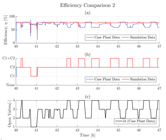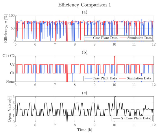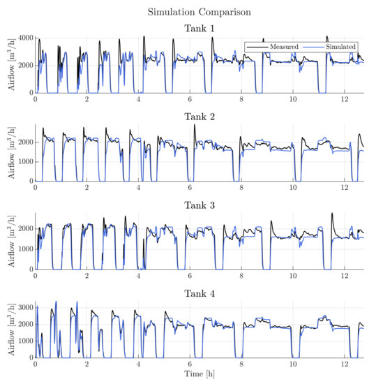 The airflow model algorithm visualized in Figure 7 is used to perform an open-loop simulation with the given input signals being real case plant data. The optimal values were estimated using the MATLAB function fminsearch, which applies the Nelder-Mead (NM) “simplex” search algorithm [60,61]. The methodology is further discussed in [28]. The cost function subject to minimization was defined as the sum of squared errors (SSE) for all data points, N, for each branch, i, as described by Equation (11).