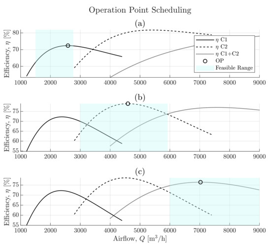 Naturally, the compressors have been designed to achieve efficient performance in a specific operating region referred to as the best efficiency point (BEP). However, when changing the system head by opening additional valves, the compressor operates further from the optimal operation point, resulting in periods with inefficient aeration [42]. This control scheme may further deteriorate the lifespan of the compressors that have to accommodate to frequent changes in system head and have to shut off entirely in intervals where few or no valves are completely open.