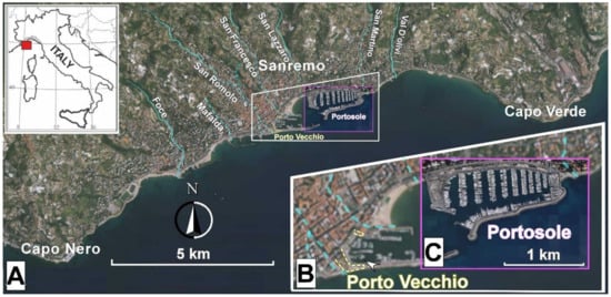 The study area is located in the central sector of the Sanremo coastline (Liguria, northwest of Italy). It is included in a wide bay of about 8 km extent, located between the Cape Nero promontory to the west and the Cape Verde promontory to the east (Figure 1), respectively featured by outcrops of marly arenaceous flysch (Campanian–Eocene) and polygenic conglomerates (Pliocene) [].