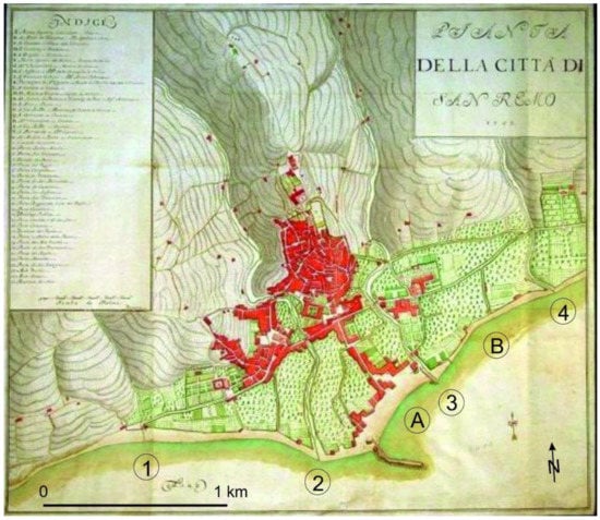 Figure 2. Historical map of Sanremo coast (1753): (1) Mafalda, (2) San Romolo, (3) San Francesco, (4) San Lazzaro streams; (A) and (B) represent the current locations of Porto Vecchio and Portosole, respectively (modified after []). - After the second half of the 19th century, the beaches were generally affected by erosion, albeit with alternating phases of advancement and retreat. Since the beginning of the 20th century, to counteract the effects of sediments deficit connected to the port works on sediment transport, the construction of numerous defense works was necessary;