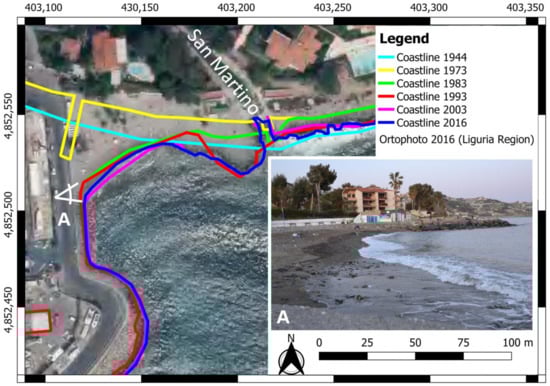 Figure 3. Variations of the position of the shoreline over the years 1944–2016 [], Liguria Region orthophoto of 2016 used as background. (A) Photo taken from the west (the point of view is indicated in white on the main map) shows the features of the shoreline deposits. The coordinates are expressed in the ETRF2000–2008.0 reference system with UTM 32 projection.