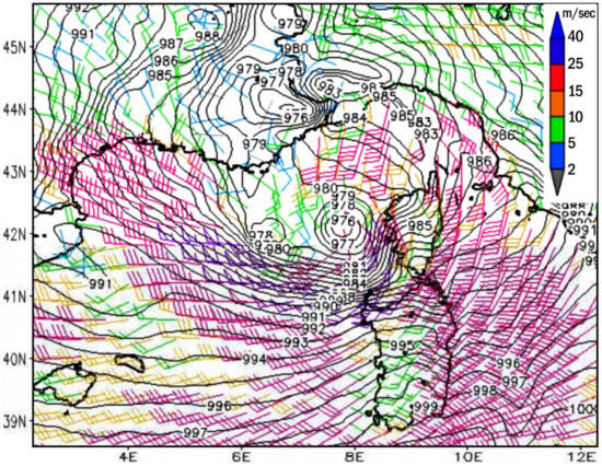 Wind at 10 m (m/s) and mean sea-level pressure (hPa) during Vaia Storm on 29 October 2018, 00 UTC (modified after ARPAL (Regional Agency for Ligurian Environment Protection) []).