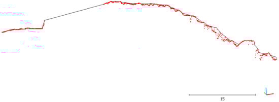 A comparison was also performed along vertical sections oriented orthogonally to the pier. The sections were extracted starting from a directrix polyline following the pier development using the CloudCompare Extract sections along polylines tool, with a 10 m step between two consecutive sections, for a total of 75 sections. Each section trace is 250 m long orthogonally to the directrix, and it has a thickness of 0.2 m in the xy plane. The section thickness is a required parameter for the Extract sections along polylines tool in case, besides the linear sections (profiles), the corresponding point cloud portions (section clouds) are needed, as in the present case. For this purpose, a thickness of 0.2 m guarantees that the section includes at least one point of the DSM, as its spacing is 0.1 m. Thus, following the tool terminology, the section cloud is a set of points falling inside a parallelepiped of undefined height and base given by the section trace length and its thickness, whereas the profile is a line that approximates the points joining them. Since the profile, for its definition and construction, describes the points configuration using approximation, the section clouds were analyzed. Figure 5 graphically represents the difference between the profile (depicted as a black line) and the section cloud (depicted as red points), referring to a portion of a representative section on the head of the breakwater of Portosole.