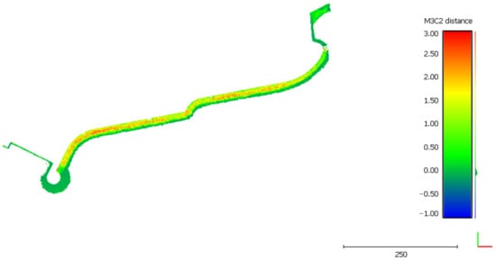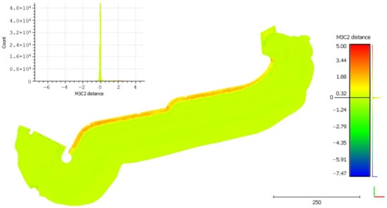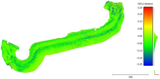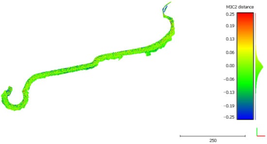 A simple difference in elevation between the DSMs was performed using the CloudCompare M3C2 plugin [], which computes the signed distances between input point clouds, i.e., the obtained distances have positive or negative signs. The M3C2 output is a new point cloud where each point represents the distance along a defined direction (the vertical direction in the present case, i.e., along the z-axis of a conventional right-handed orthogonal Cartesian triplet) between the reference and the compared point clouds. The M3C2 output cloud follows this convention: positive sign if the compared DSM has a higher height concerning the reference DSM, negative sign vice versa.