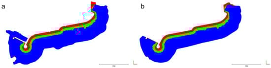 Then, to give an overall idea of the average height variation (Δh), the ratio between the volume variation ΔV and the total extent S was computed for the sea bottom, the submerged and the emerged breakwater portions, using the relation in Equation (4), where Vd and Ve are the deposited and the eroded volumes, respectively.