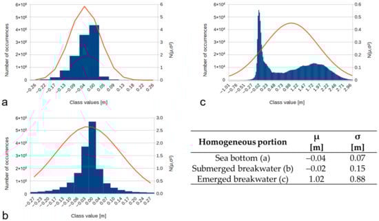 Moreover, it is noteworthy to underline how the values of average values µ and standard deviations σ reported in the table inside Figure 11 are compatible with the ones computed using an independent method and contained in the following Table 1. Furthermore, in this case, the most pronounced variation is found in the emerged breakwater portion.
