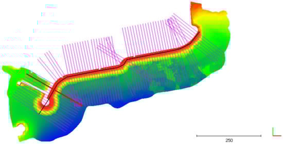 For a more accurate comparison between the DSMs, 250 m long vertical sections and with a 10 m, for a total of 75 sections, were extracted. These section traces, represented in pink in Figure 12, are oriented orthogonally to the breakwater, whose directrix is represented as a black line in Figure 12.