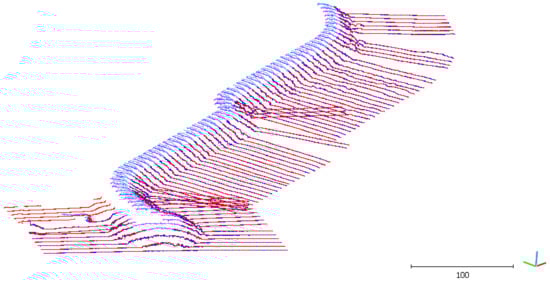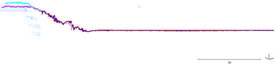 Figure 13 represents a view of the section clouds (from the head of the breakwater, thus almost from southwest to northeast). The red-magenta and blue-cyan section clouds depict the submerged and emerged breakwater points for DSM 1 and DSM 2, respectively. To perform this, the CloudCompare Filter points by values tool was used to distinguish the points below 0 m from the points above it. Figure 14 represents a zoom of the extracted section clouds along the section trace number 12, highlighted in red in Figure 12, to better underline and quantify the distances between DSM 1 and 2.