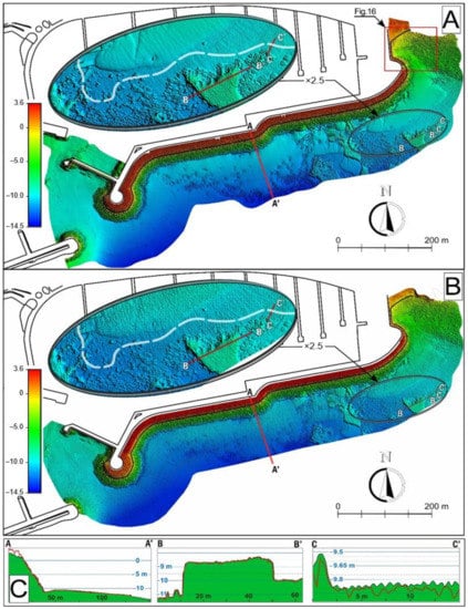 The seabed morphology facing the breakwater shows a regular deepening (about 4%) of the bathymetry, between 10 m up to 14 m (section A–A’ in Figure 15C).