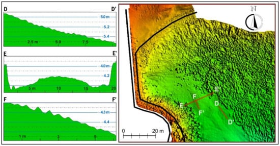 As shown in the sections C–C’ in Figure 15C, D–D’ and F–F’ in Figure 16, ripple marks of different sizes can be recognized, whose wavelengths range between 0.4 and 1 m, according to the hydraulic regime. Their structures indicate a vergence towards the coast.