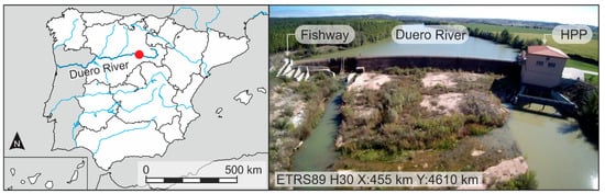 The study was carried out in the mainstem of the Duero River, near the village of Guma (Burgos), northwest part of Spain (Figure 1). The Duero River basin presents a high degree of fragmentation, with nearly 5200 obstacles in the Spanish part of the basin alone, from which, 141 are small HPPs and 23 are large HPPs [43,47].