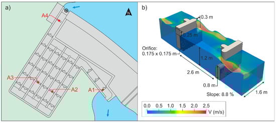 (a) Plan view of Guma fishway and passive integrated transponder (PIT) antenna location (A). (b) 3D scheme of the submerged notch with bottom orifice fishway together with principal hydraulic variables.