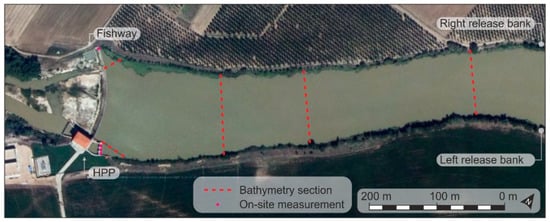 The Guma HPP is a run-of-the-river HPP with a total height of 8.85 m, an installed capacity of 2.25 MW, and two Kaplan turbines. Due to the run-of-the-river configuration, there is no legal requirement for maintaining a minimum environmental flow through the dam. In the right bank of the dam, there is a pool and weir type fishway (Figure 2) composed of 36 cross-walls with submerged notches and bottom orifices (notch width = 0.3 m; sill height = 0.8 m; orifice size = 0.175 m × 0.175 m) and 35 pools (length = 2.6 m; width = 1.6; depth 1.2 m; slope = 8.6%), with mean water drops of 0.25 and a volumetric power dissipation of 121 ± 10 W/m3. All the hydraulic parameters of the fishway are within the recommended ranges according to the most important design guidelines for this fishway type and target species [24,51,52]. Moreover, this fishway has been previously evaluated for barbel upstream movements, showing a passage success of between 73 and 94% (confined and free trials; [53]). The fishway discharge operation varies from 0.25 to 0.50 m3/s in order to ensure the correct operation of the fishway and that fish can correctly locate the downstream by-pass access from the river to the fishway. Likewise, the facility has an additional channel that joins the turbines outlet and the entrance bypass access, which provides a supplementary attraction flow near the fishway entrance (5% of the competing flow between the fishway and the turbines).